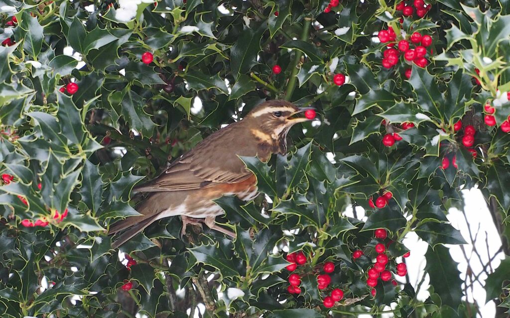 Für ein paar Tage machten fünf Rotdrosseln (Turdus iliacus) Rast in unserem Garten. Die Gäste aus Nordeuropa oder gar Russland waren auf der Durchreise in die wärmeren südlichen Gebiete Europas. Die Vögel ernährten sich von den roten Beeren in der Ilex-Hecke. Sie sind kleiner als Amseln oder Singdrosseln und leicht am rahmfarbenen Überaugenstreif und den rostroten Flügelunterseiten zu erkennen.