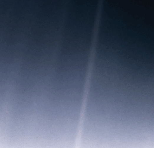 In der Mitte des NASA-Fotos sieht man den „Pale Blue Dot“, den winzigen blassen blauen Punkt im Weltall – die Erde, die unser aller Zuhause ist. Das Foto wurde am 14. Februar 1990 von der Raumsonde Voyager 1 aus einer Entfernung von ca. 6 Milliarden Kilometern aufgenommen. Der Planet Erde ist ungefähr 4,5 Milliarden (4.500.000.000) Jahre alt. Die Spezies Homo sapiens lebt hier erst seit etwa 300.000 Jahren. Das sollte uns zu denken geben: wie wichtig wir im All sind und wie wir mit uns und mit dem Planeten umgehen…