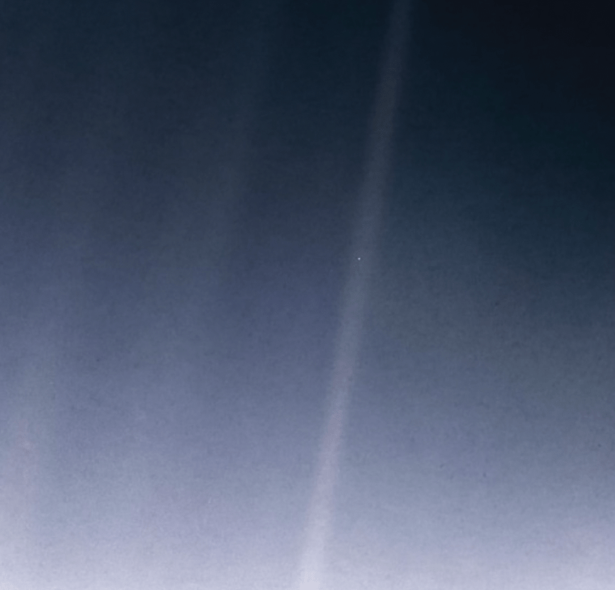 In der Mitte des NASA-Fotos sieht man den „Pale Blue Dot“, den winzigen blassen blauen Punkt im Weltall – die Erde, die unser aller Zuhause ist. Das Foto wurde am 14. Februar 1990 von der Raumsonde Voyager 1 aus einer Entfernung von ca. 6 Milliarden Kilometern aufgenommen. Der Planet Erde ist ungefähr 4,5 Milliarden (4.500.000.000) Jahre alt. Die Spezies Homo sapiens lebt hier erst seit etwa 300.000 Jahren. Das sollte uns zu denken geben: wie wichtig wir im All sind und wie wir mit uns und mit dem Planeten umgehen…