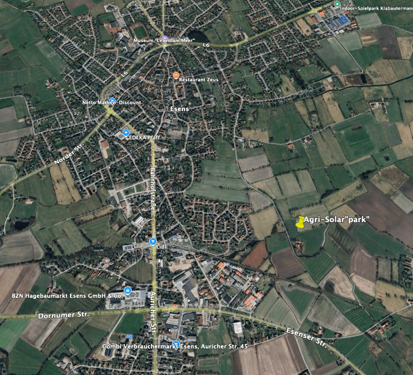 Vorwärts immer, rückwärts nimmer, oder so ähnlich wie weiland in der DDR von Erich H. (der, der das Licht ausmachte) verbreitet: „Die Energiewende in ihrem Lauf hält weder Ochs noch Esel auf „. Und so geht es denn auch weiter in der Samtgemeinde Esens im Landkreis Wittmund mit den „Erneuerbaren“ aus Wind und Sonne. In Fulkum sollen neue Windkraftanlagen entstehen (da stehen schon fast 50 Anlagen im Nachbarort Utgast), auch in Stedesdorf arbeitet man an einer „Verdichtung“ des bestehenden Windparks, obwohl das gesetzliche Soll an Windpropellern im Landkreis schon weit übererfüllt ist. Geldgeilheit, sonst nichts, ist die Triebfeder. Das Erneuerbare-Energien-Gesetz als Gelddruckmaschine für die Betreiber zu Lasten der Steuerzahler und die neuen lobbygeführten Beschleunigungsgesetze der Bundesregierung machen es möglich. Der neue Landschaftshammer sind Agri-Photovoltaikanlagen, große Solarpaneele, unter oder zwischen denen noch landwirtschaftliche Nutzung möglich ist.